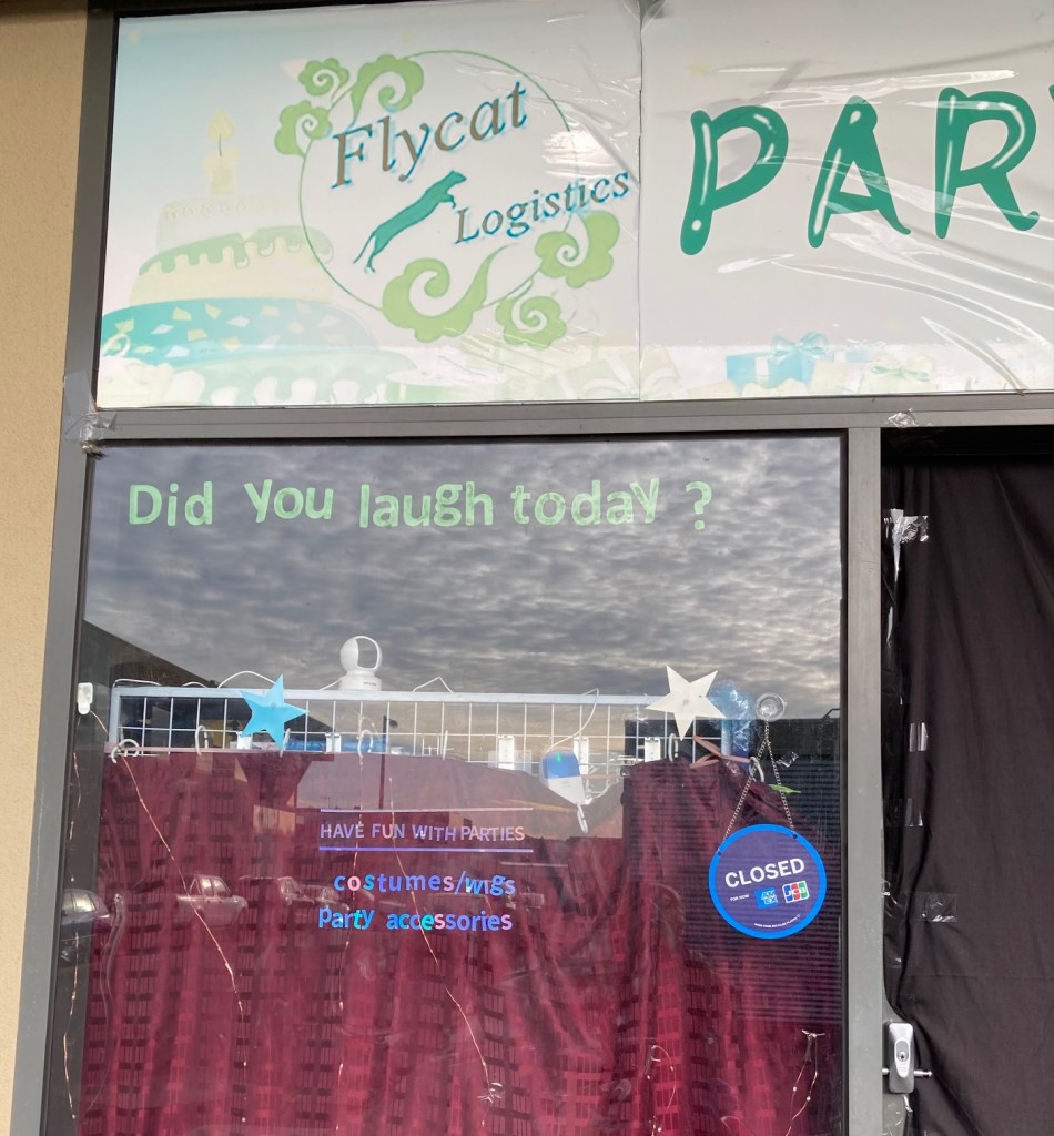 ‘Did you laugh today/’ the wonky lettering says, or threatens. I might have, but nowhere near your scary store. ‘Shuddering’ was the response your sign created.